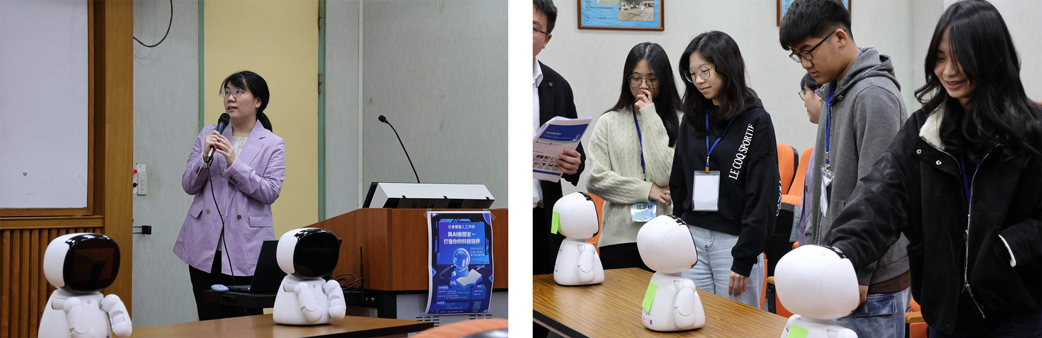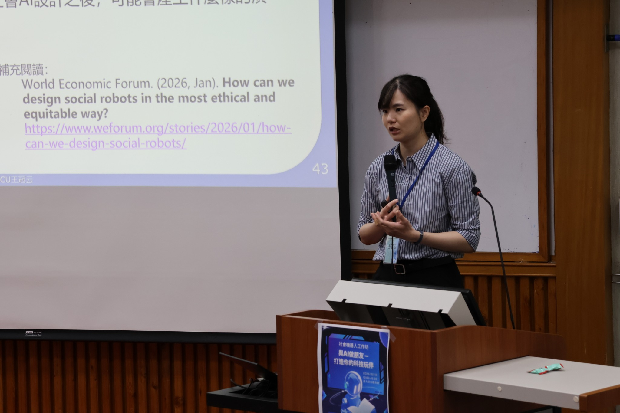 工作坊分為講座與實作兩大部分。首先由輔仁大學資管系王冠云助理教授(臺灣社會機器人學學會秘書長)主講「什麼是社會機器人?從物理 AI 到社會 AI」。王教授以深入淺出的方式,從社會機器人的基本理論與核心概念談起,解析其在人工智慧發展脈絡中的定位,並延伸至虛擬聊天機器人與實體機器人的應用場景。憑藉心理學與人工智慧的跨域背景,王教授分享研究與產業實務經驗,並與學員熱烈互動,邀請大家分享對機器人的想像與生活經驗,現場討論氣氛熱絡。